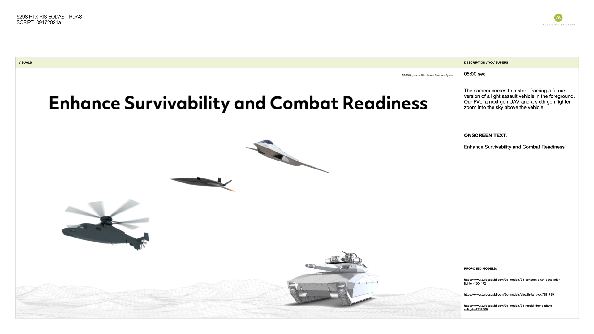 Raytheon Intelligence & Space commissioned an animation illustrating the capabilities of their Raytheon Distributed Aperture System (RDAS). Available for UAV, modern fighters, ground vehicles, as well as the Future Vertical Lift program (featured in the video) currently in development by the U.S. military, the RDAS gives the warfighter 360° spherical situational awareness. The aircraft and RDAS unit were modeled and rendered in Autodesk Maya. The environments and mission sequences were assembled and rendered in After Effects.